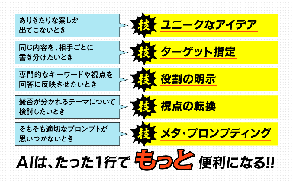 たった一言添えるだけでAIからの回答の精度が大きく変わるコツや、ビジネスシーンに直結するテクニックを厳選。ChatGPT だけでなく、Claude やGemini など他の生成AI ツールにも応用可能な「共通プロンプト」として活用することができます。
